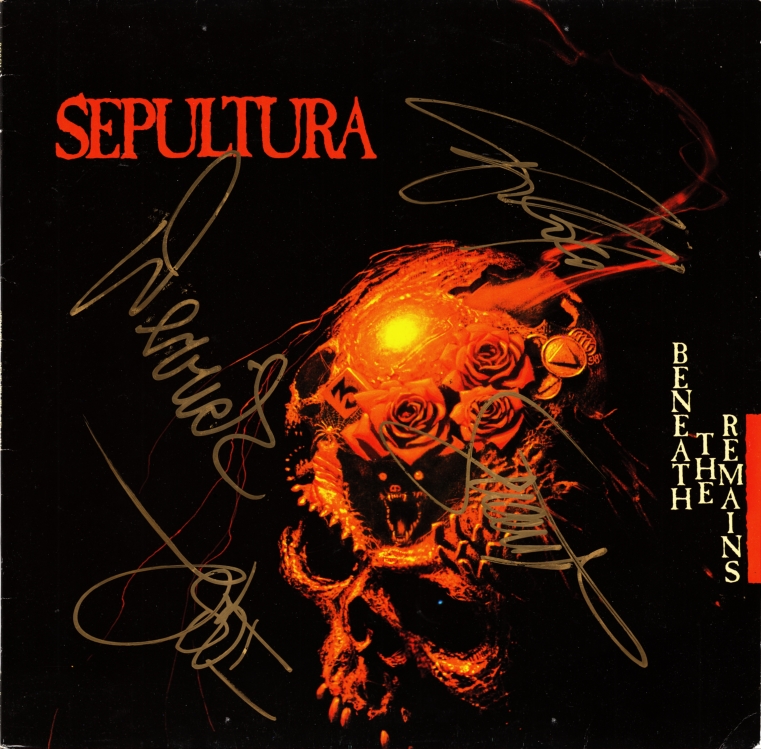 Sepultura Album BENEATH THE REMAINS, signiert von Max Cavalera, Igor Cavalera, Andreas Kisser und Paulo X. Pinto