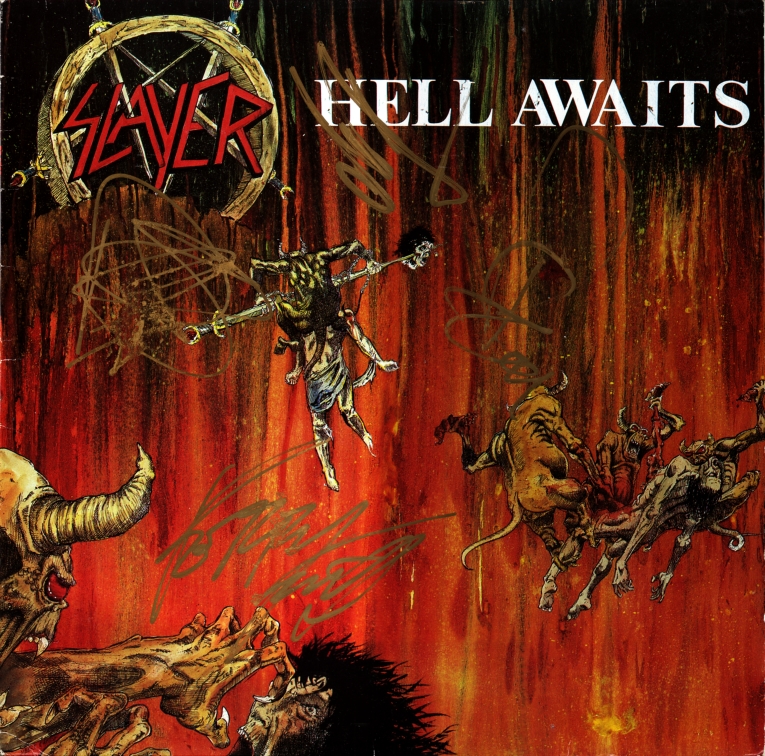 Das Hell Awaits Album von 1985, signiert von Kerry King, Tom Araya, Jeff Hanneman und Dave Lombardo!