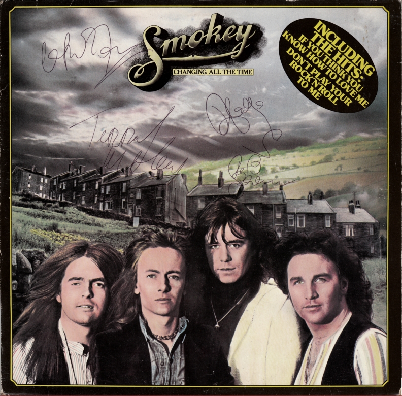 Smokey LP Changing all the Time von 1975, signiert von Chris Norman, Terry Uttley, Alan Silson und Pete Spencer